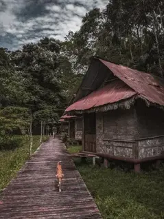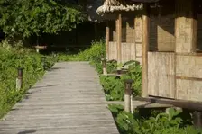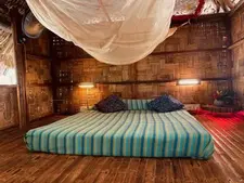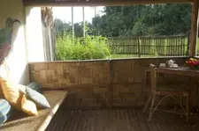These delightful single story bamboo accommodations overlook the lush green jungle and country paddy fields. The bungalows are fan cooled and contain a bedroom fitted with double bed & mosquito net as well as a generously sized attached bathroom. The sitting room has a space to relax and a writing desk where you can open up the blinds to enjoy the fresh air and soothing views…ideal for bird watching!